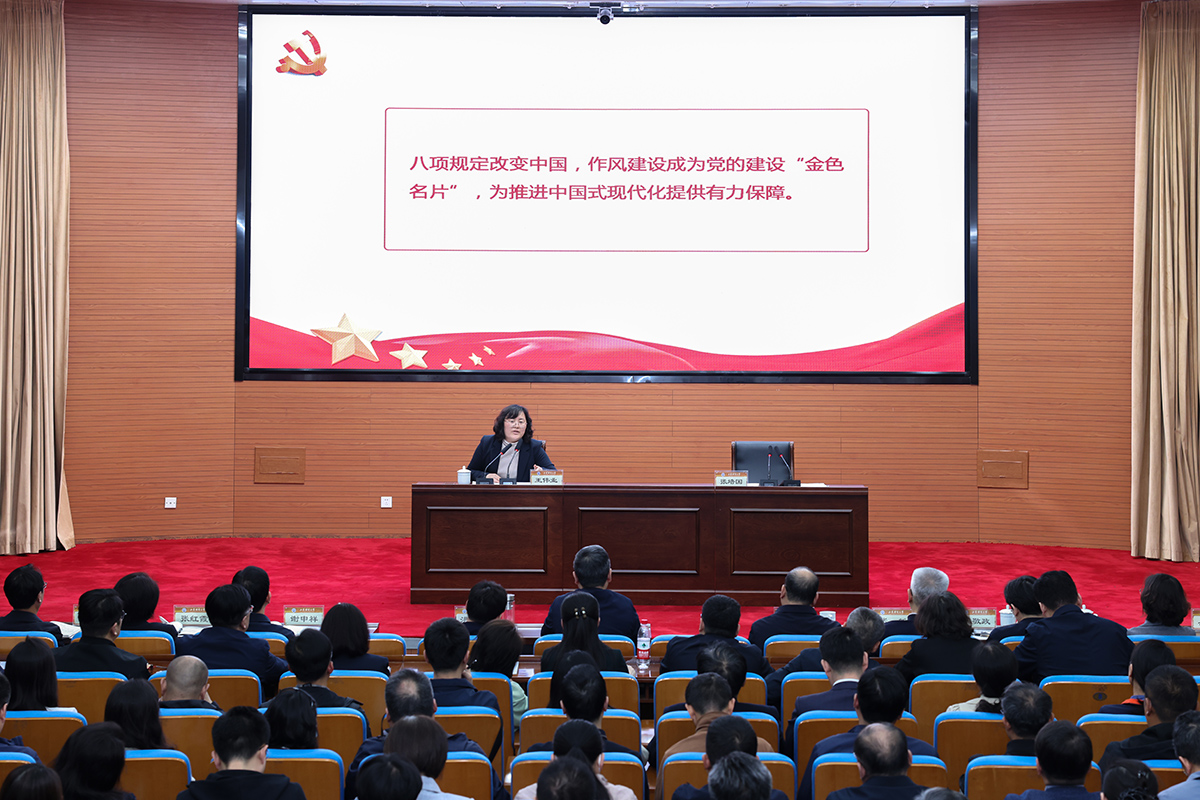 4月9日下午,读书班邀请山东省纪委监委第四监督检查室三级调研员王伟业作了题为《深入贯彻中央八项规定精神,坚定不移将党的作风建设引向深入》的辅导报告。报告围绕学习贯彻习近平总书记关于加强党的作风建设的重要论述和中央八项规定精神等方面作了深入讲解和系统辅导。校党委副书记张培国主持了报告会,并按规定传达了上级文件,学校领导、全体中层干部、全体辅导员、机关处室科级干部代表、学生党员代表聆听了辅导报告。